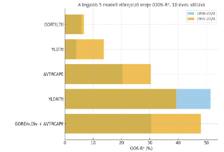 Az ábrán látható OOS-R² értékek azt mutatják meg, hogy az egyes modellek mennyivel pontosabban jelezték előre a jövőbeli részvénypiaci hozamokat, mint egy egyszerű, múltbeli átlaghozamra épülő becslés. Ez az úgynevezett out-of-sample (mintán kívüli) tesztelés azt méri, mennyivel csökken a modell előrejelzési hibája az alapforgatókönyvhöz képest. A legjobb modellek esetében az értékek 30–50% közé esnek, ami azt jelenti, hogy ezek a módszerek a jövőbeli hozamok becslési hibáját közel a felére csökkentették. Fontos azonban látni, hogy ez nem a teljes variancia megmagyarázását jelenti, hanem az előrejelzési hiba csökkenését – vagyis a modellek nem látnak a jövőbe, de statisztikailag kimutathatóan jobb becslést adnak, mint a múltbeli átlag.