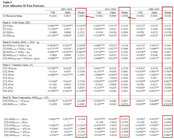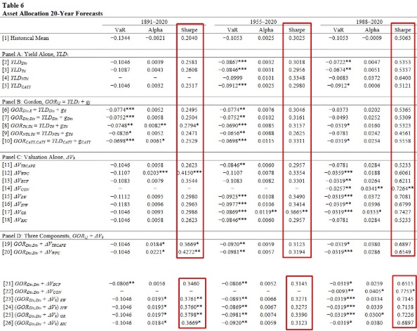 A következő táblázatban több időszakra lebontva (1891-2020, 1955-2020, 1988-2020) láthatjuk az egyes hozam-előrejelző módszerek hatékonyságát. A sharpe ráta sor a módszerrel elérhető egységnyi kockázatra vetített hozamot mutatja (magyarázat itt). Érdemes összevetni a történelmi átlagon alapuló (Historical Mean) előrejelzés sharpe rátáival (0,19, 0,26, 0.31).