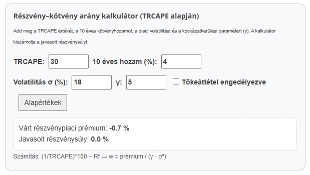 Az alábbi kalkulátor segíthet megérteni a részvény-kötvény arány változásának mechanizmusát. A kalkulátor kizárólag oktatási célokat szolgál. Az eszköz az alapvető pénzügyi összefüggések – például a várt részvénypiaci prémium és a kockázatkerülés hatásainak – megértését segíti. Az eredmények nem alkalmasak tényleges portfólióarányok meghatározására vagy jövőbeli piaci hozamok előrejelzésére.