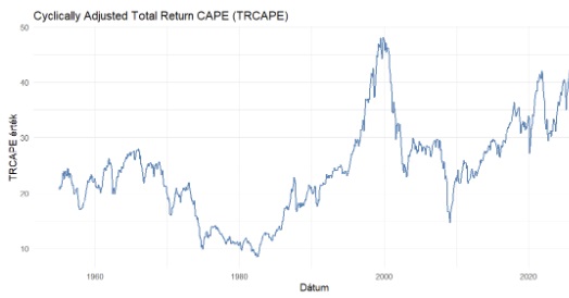A grafikon Shiller professzor adatai alapján számított TRCAPE mutató alakulását mutatja be, amely 1950 óta 8 és 45 pont közötti tartományban ingadozott.