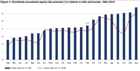 A részvénypiac kockázati prémiuma azt a többlethozamot jelöli, mellyel a részvények felülteljesítik a kötvényeket. Ahogy az alábbi képen is látható, végtelen időtávon a részvénypiaci kockázati prémiuma pozitív (lásd 1900-2010 közötti átlagokat).