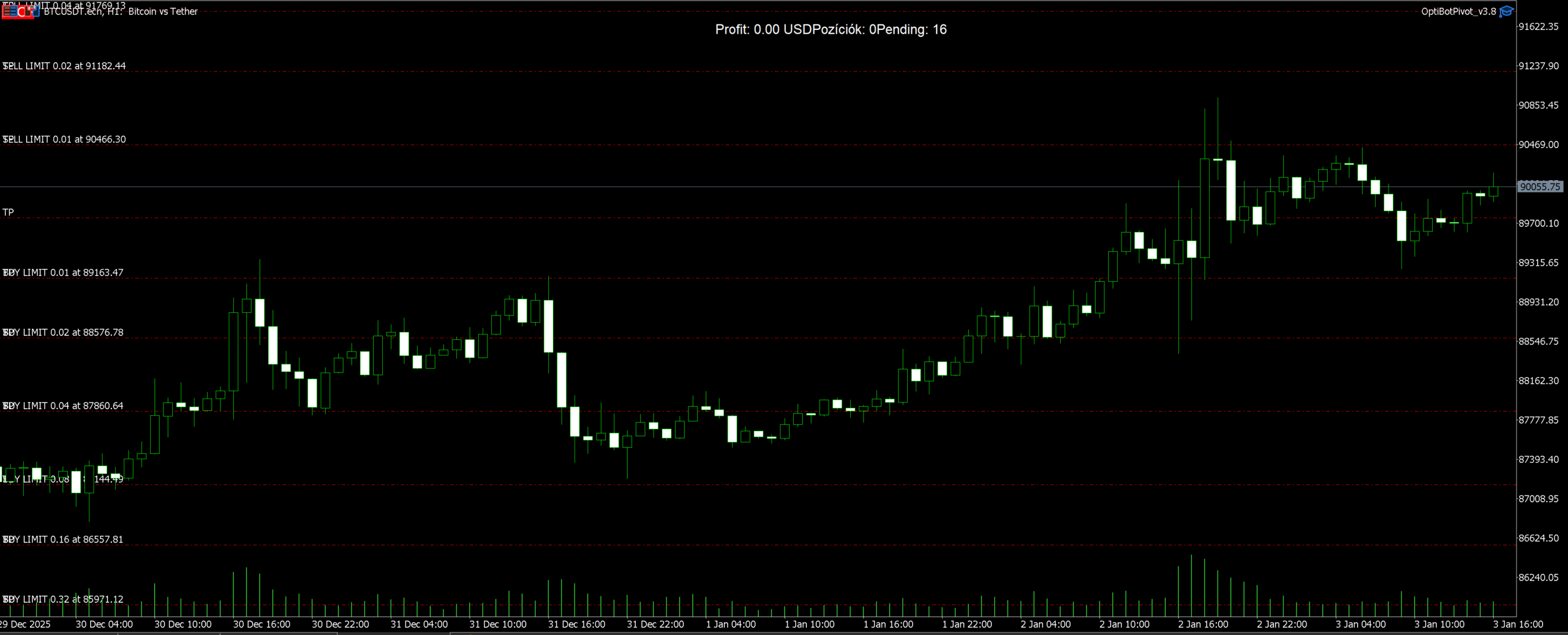 Az OptiBotPivot EA egy teljesen automatizált grid trading stratégia. Az előző nap pivot szintjeit használja 16 potenciális kereskedési lehetőség azonosítására. Progresszívan növekvő pozíciómérettel kereskedik, ami azt jelenti, hogy a stratégia nagyobb nyereségre törekszik, ha az ár továbbmegy az első szinteken túl. Az EA automatikusan indul és zárja naponta, biztosítva, hogy friss szintekből indul minden kereskedési nap. Az egy kézi stop/start vezérléssel is rendelkezik, ha a kereskedő bármilyen okból le szeretné állítani a kereskedést.